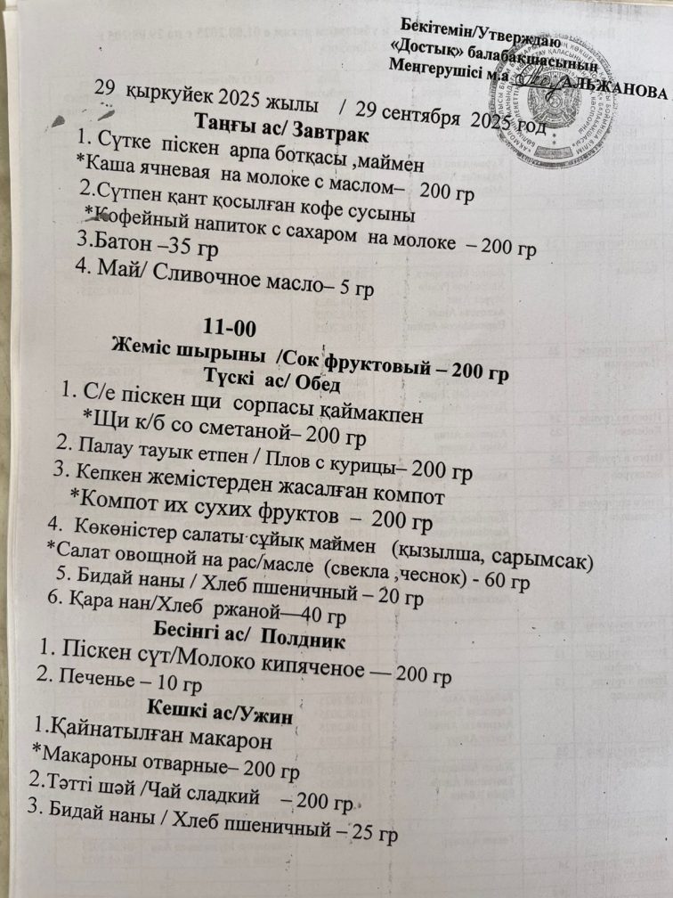 1.Борщна мк/б со сметаной (после термической обработки) 2.Хинкали (Манты) 3.Компот из сухофруктов 4.Салат «Случ» (помидоры, морковь, чеснок) на растительном масле 5.Хлеб пшеничный 6. Хлеб ржаной |